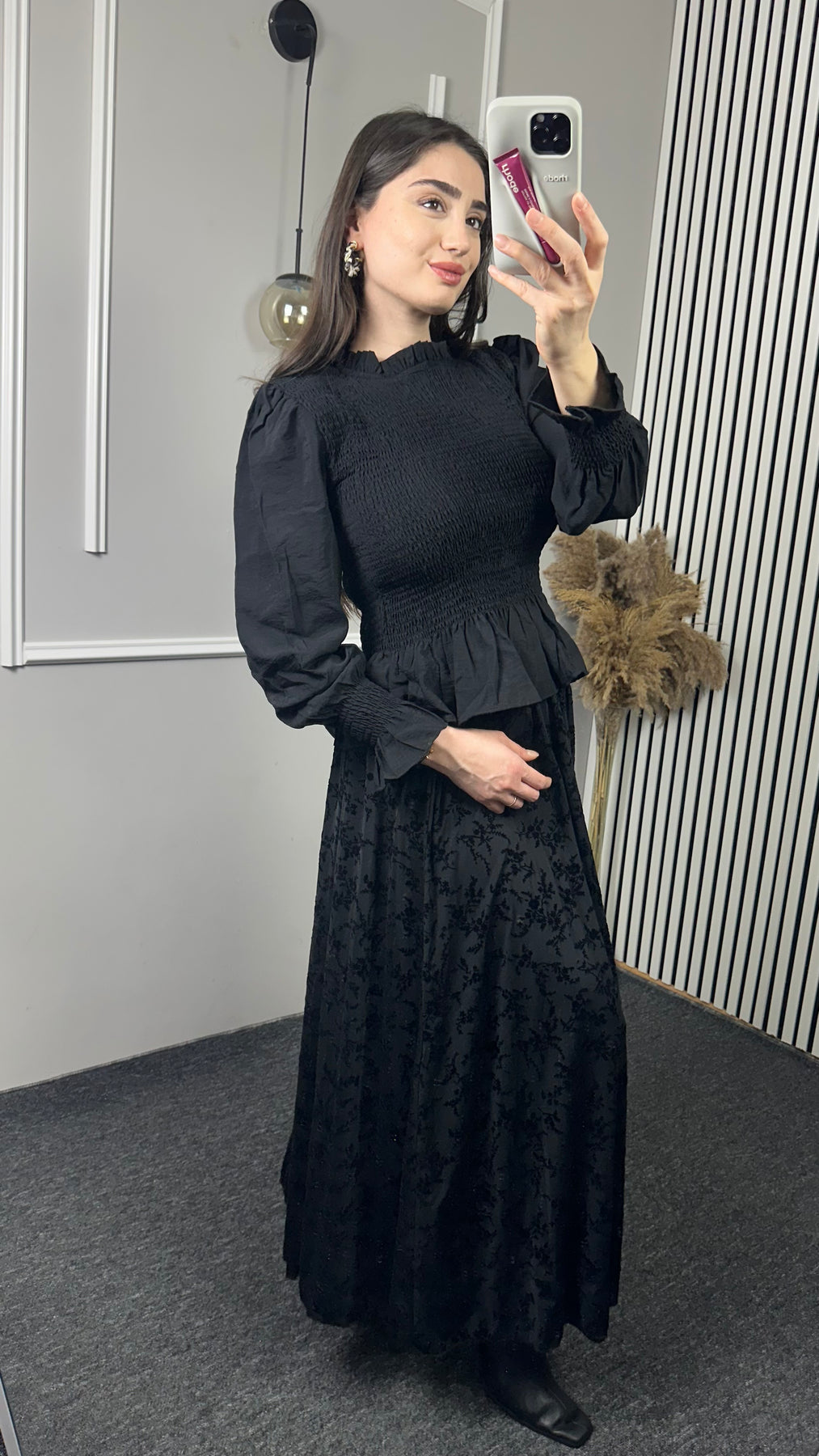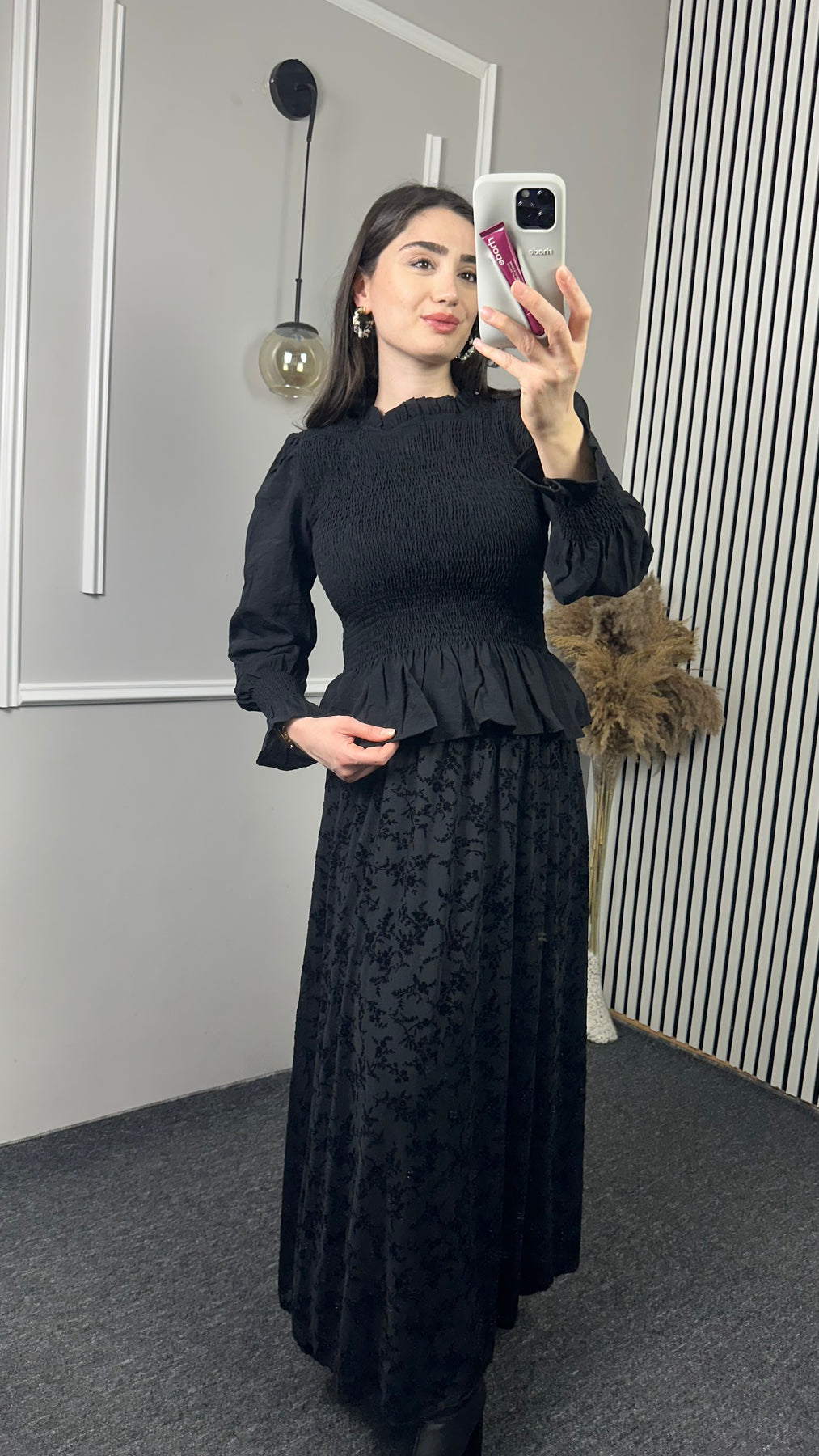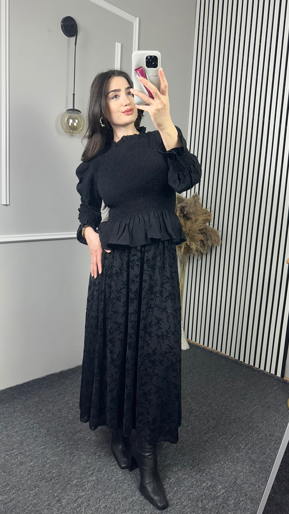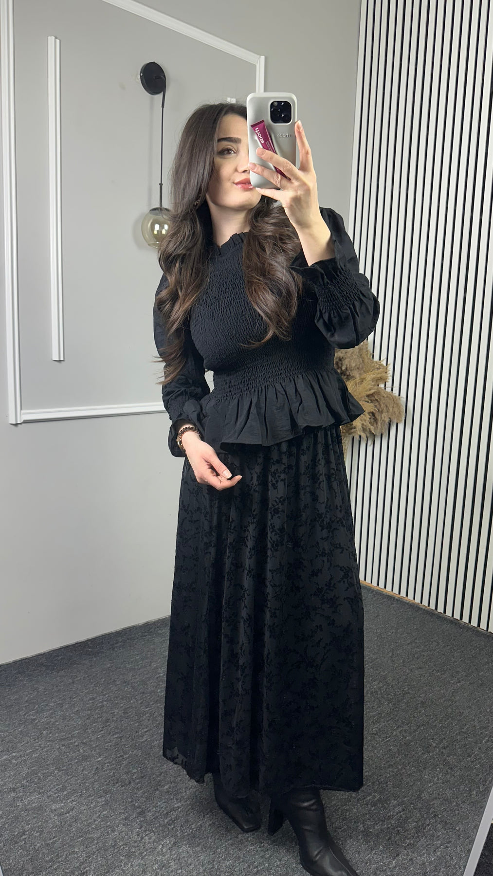 Tüllü Astarlı Desenli Uzun Siyah Etek
