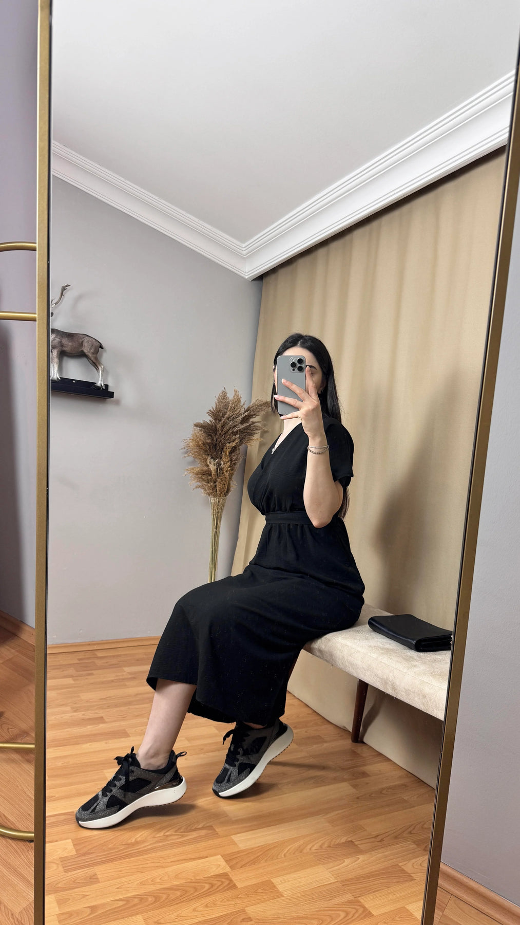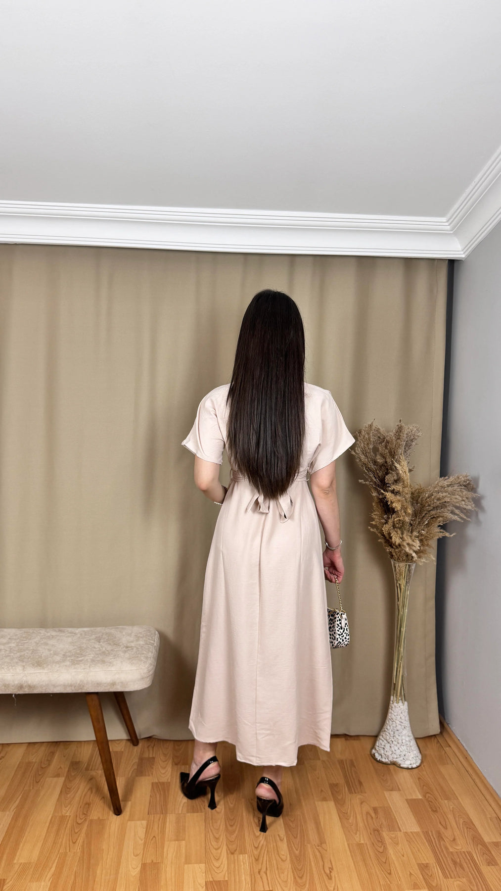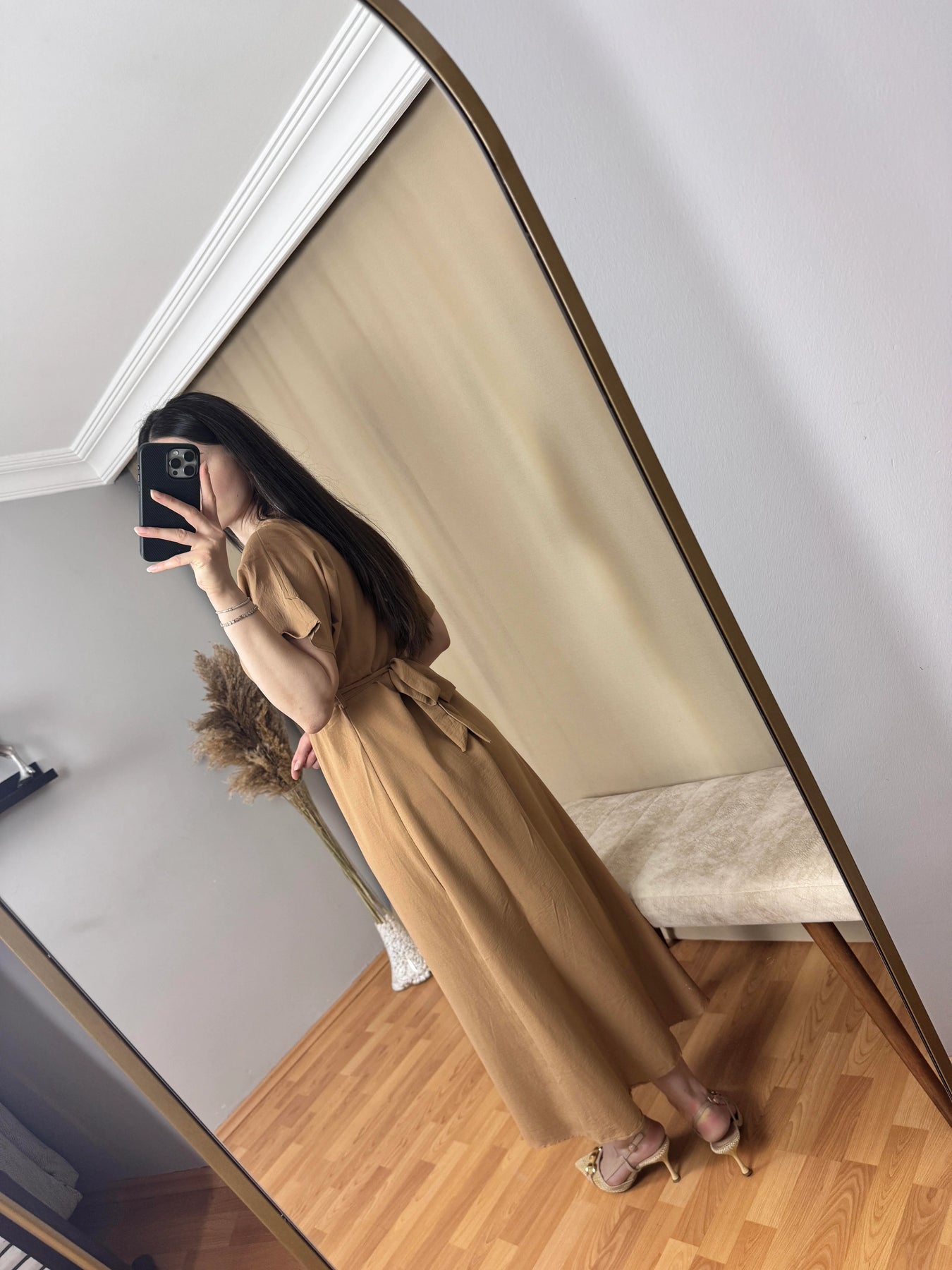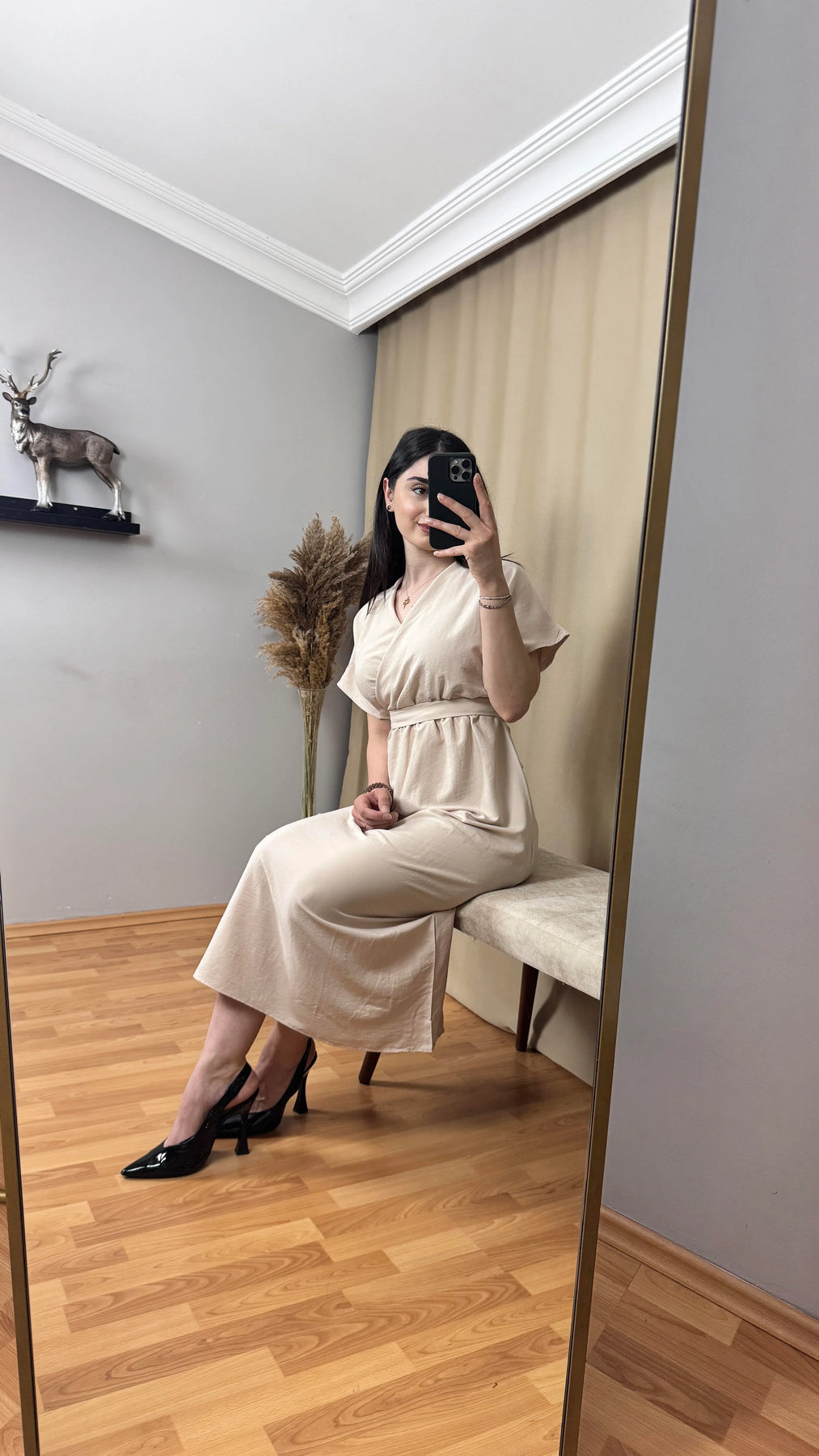 Kuşaklı Midi Boy Pamuk Keten Elbise