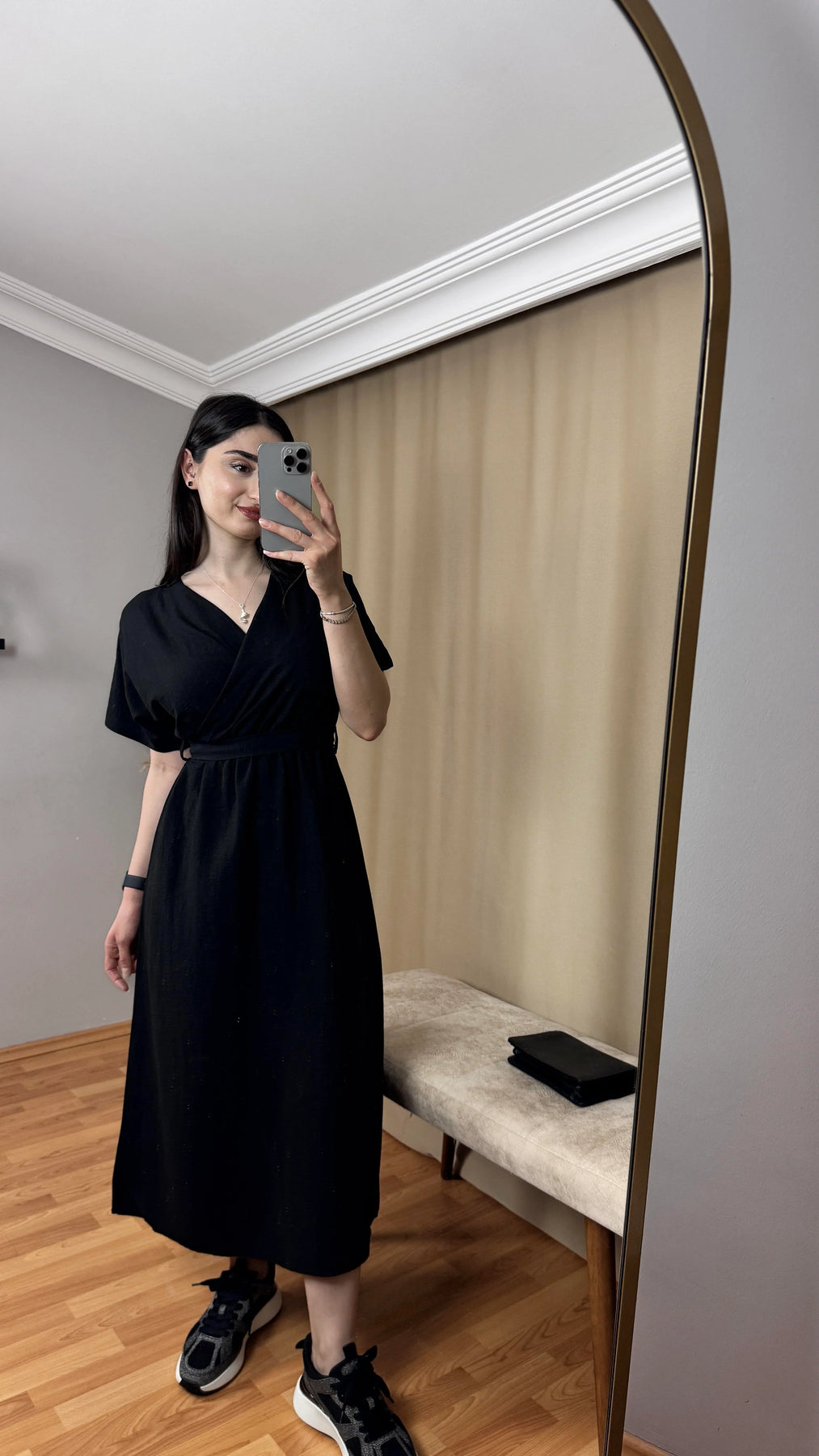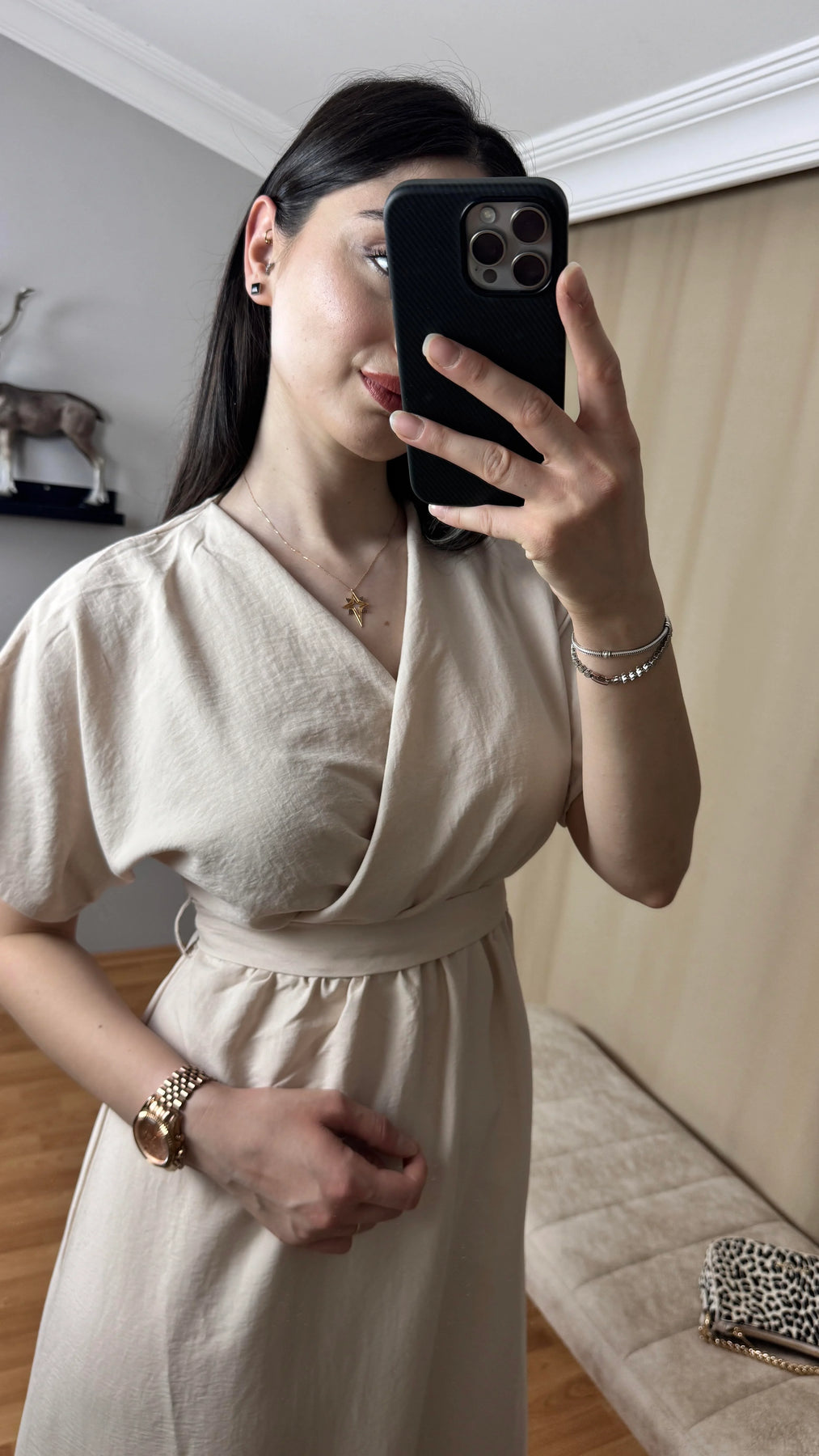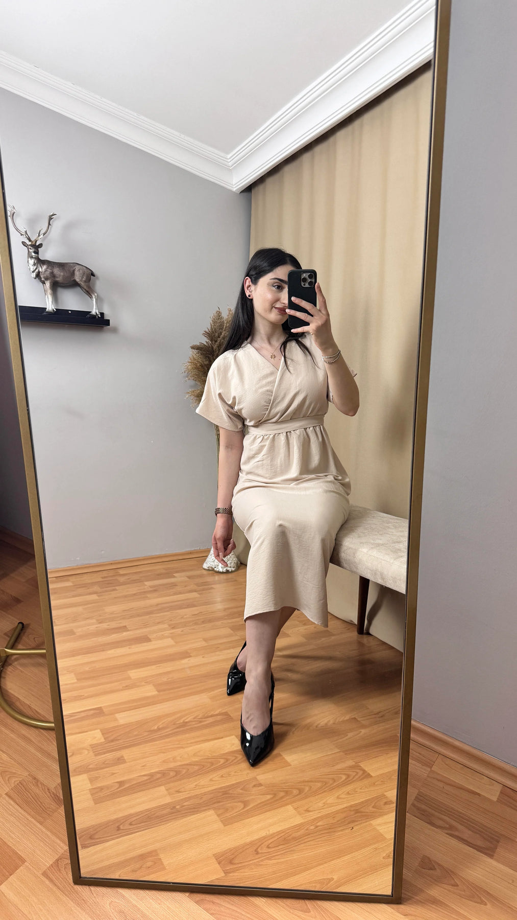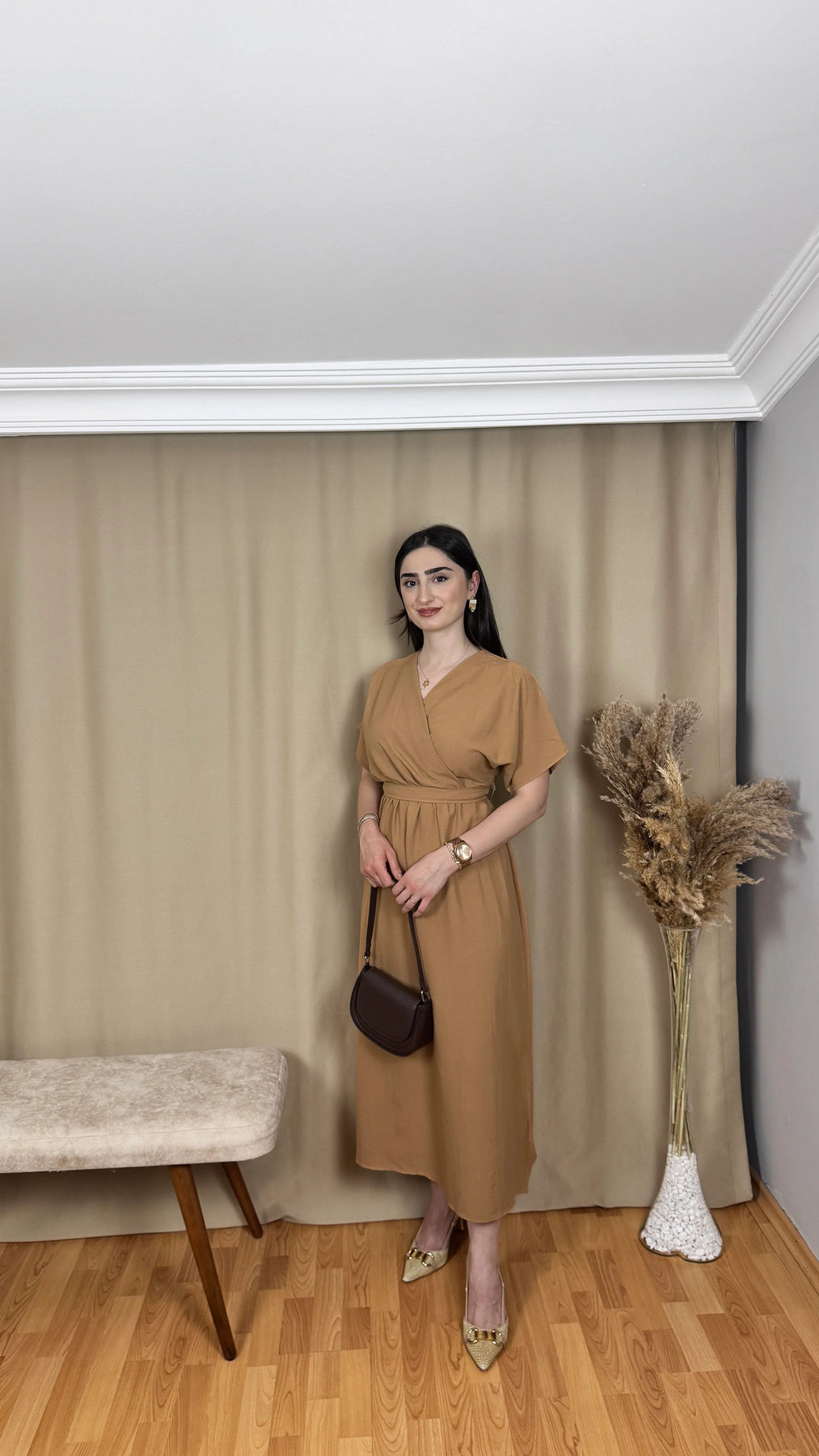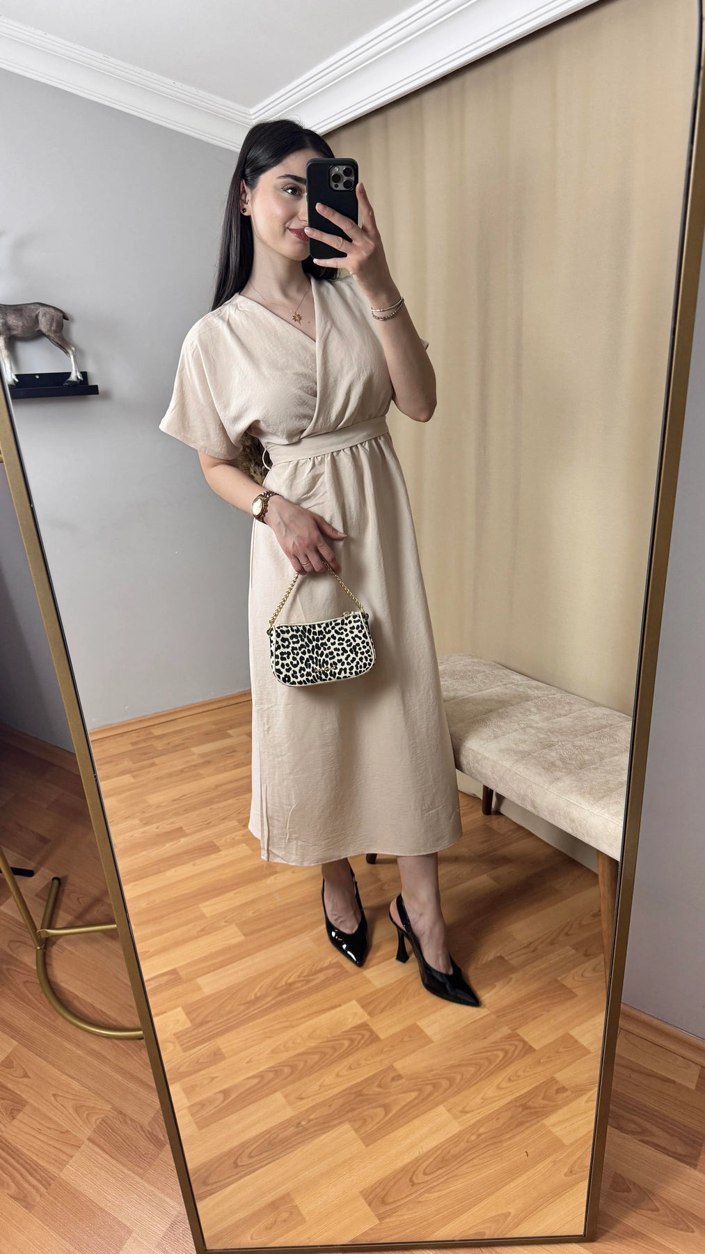 Kuşaklı Midi Boy Pamuk Keten Elbise