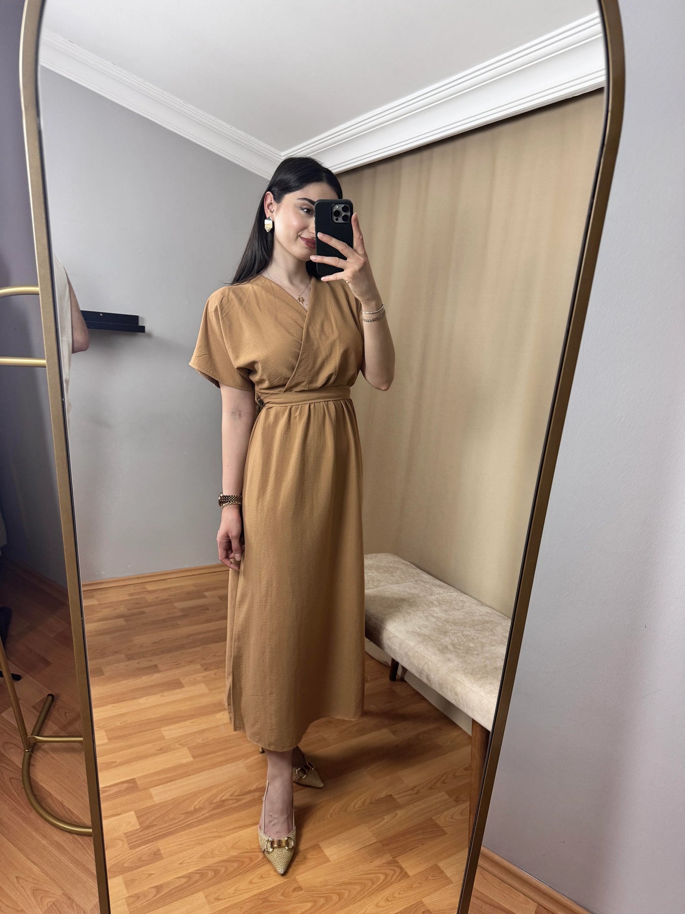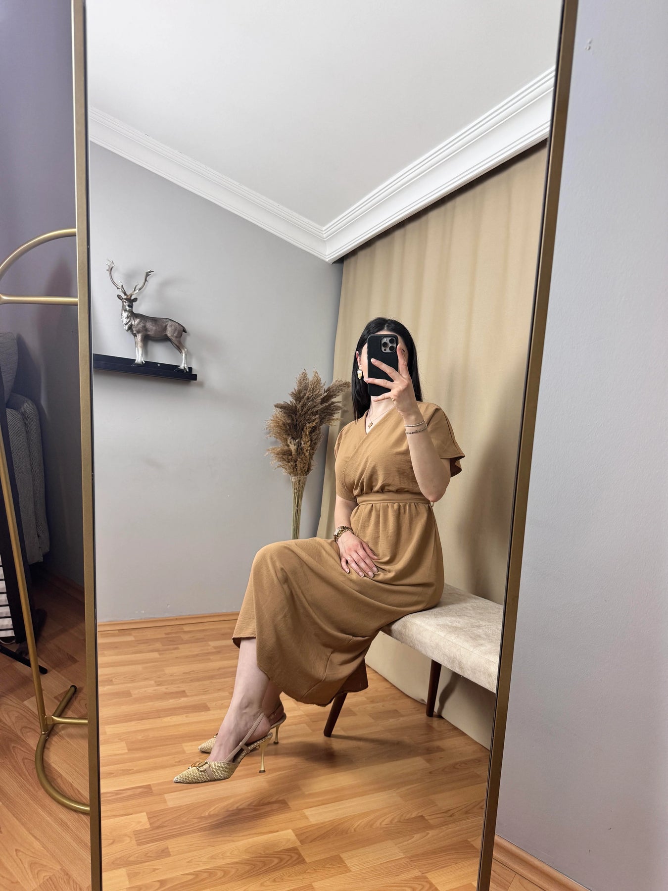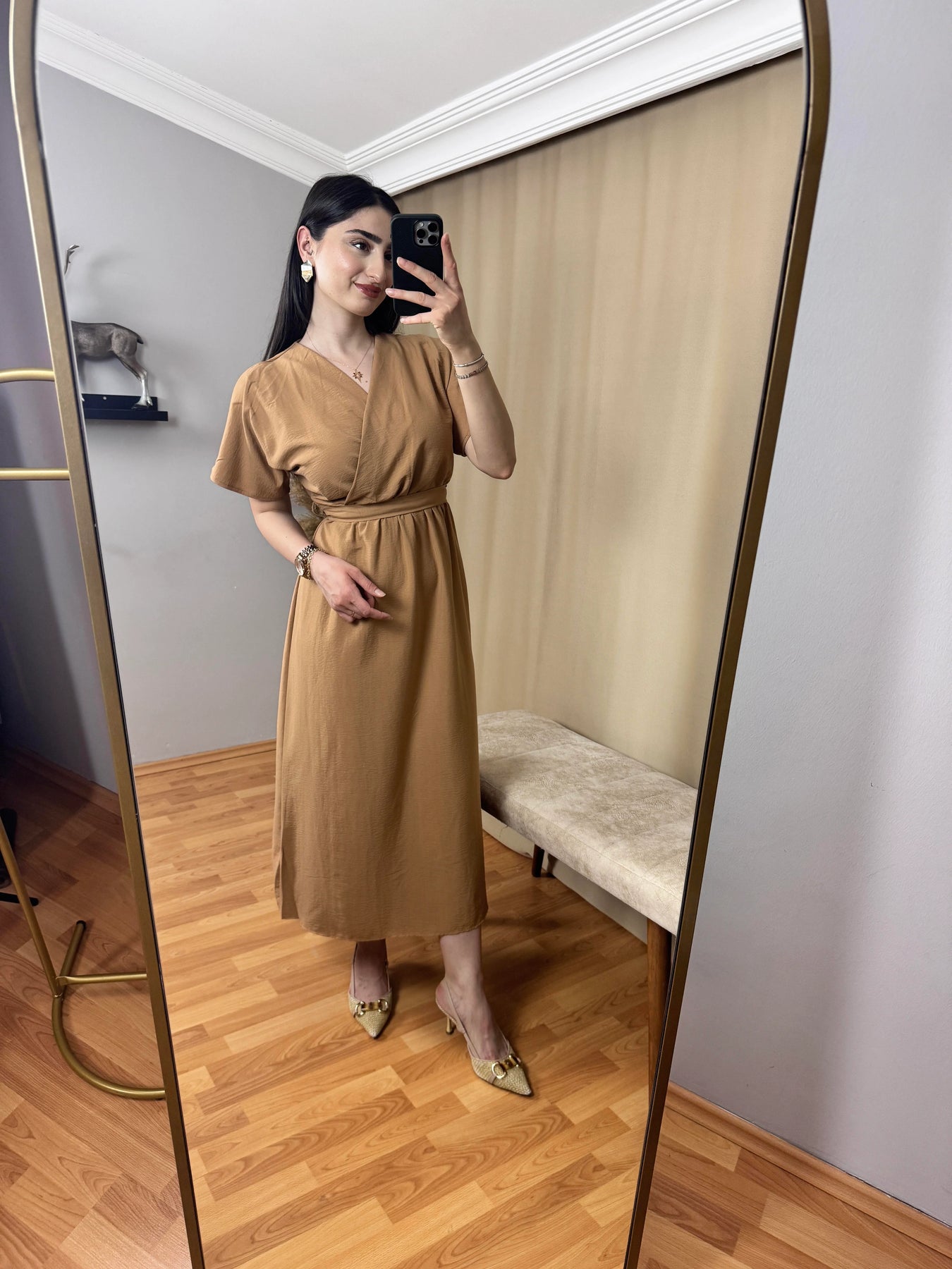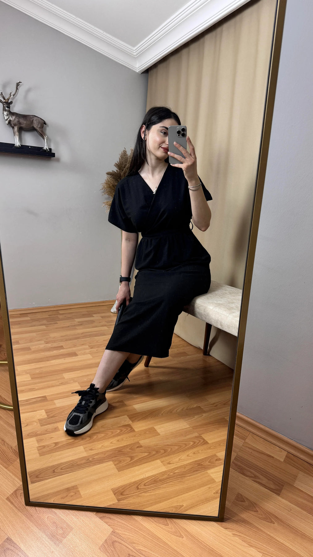 Kuşaklı Midi Boy Pamuk Keten Elbise