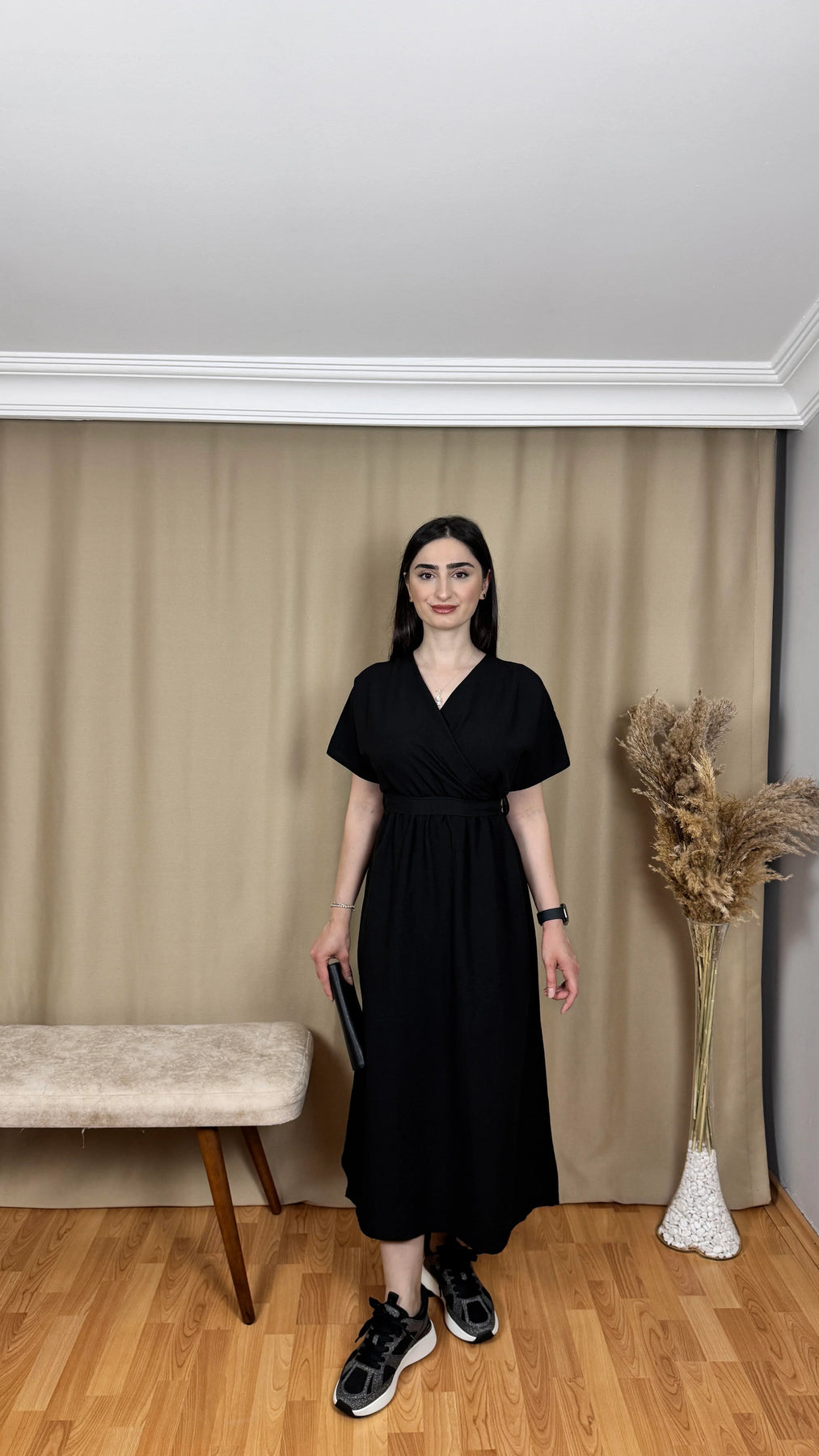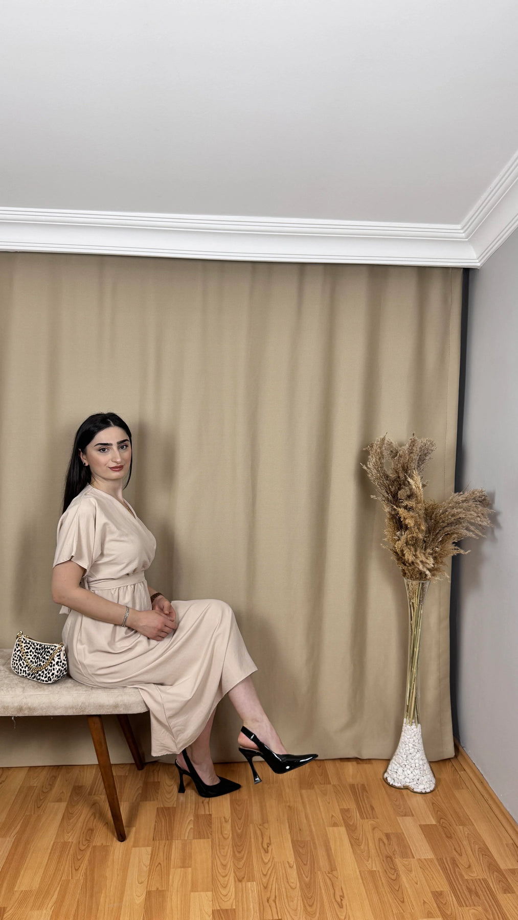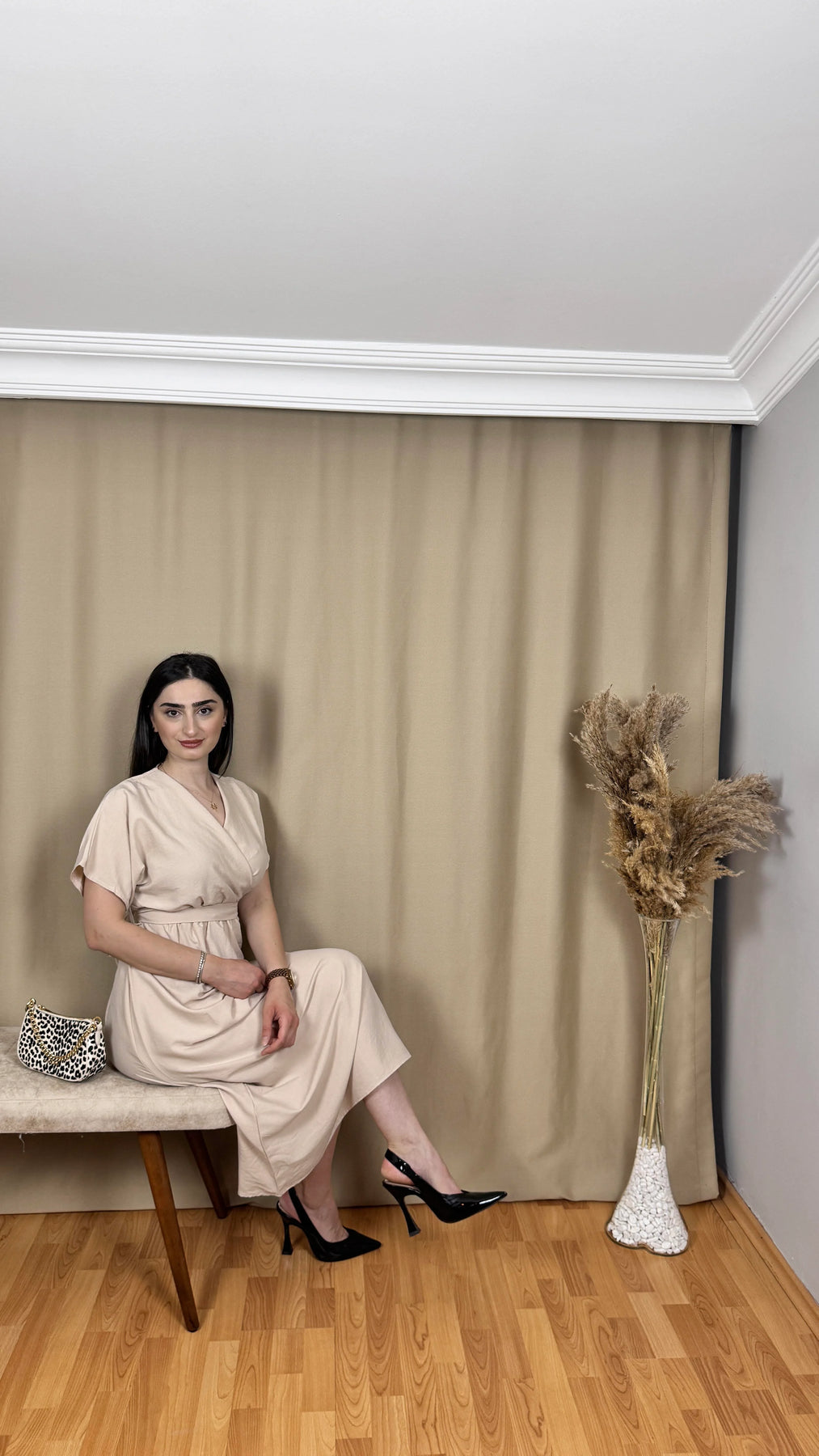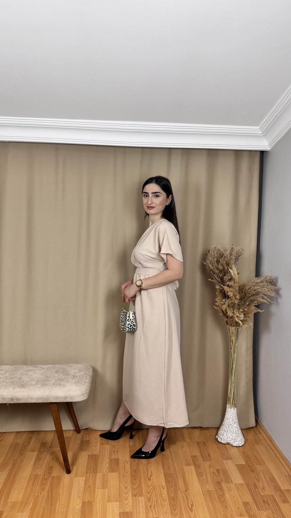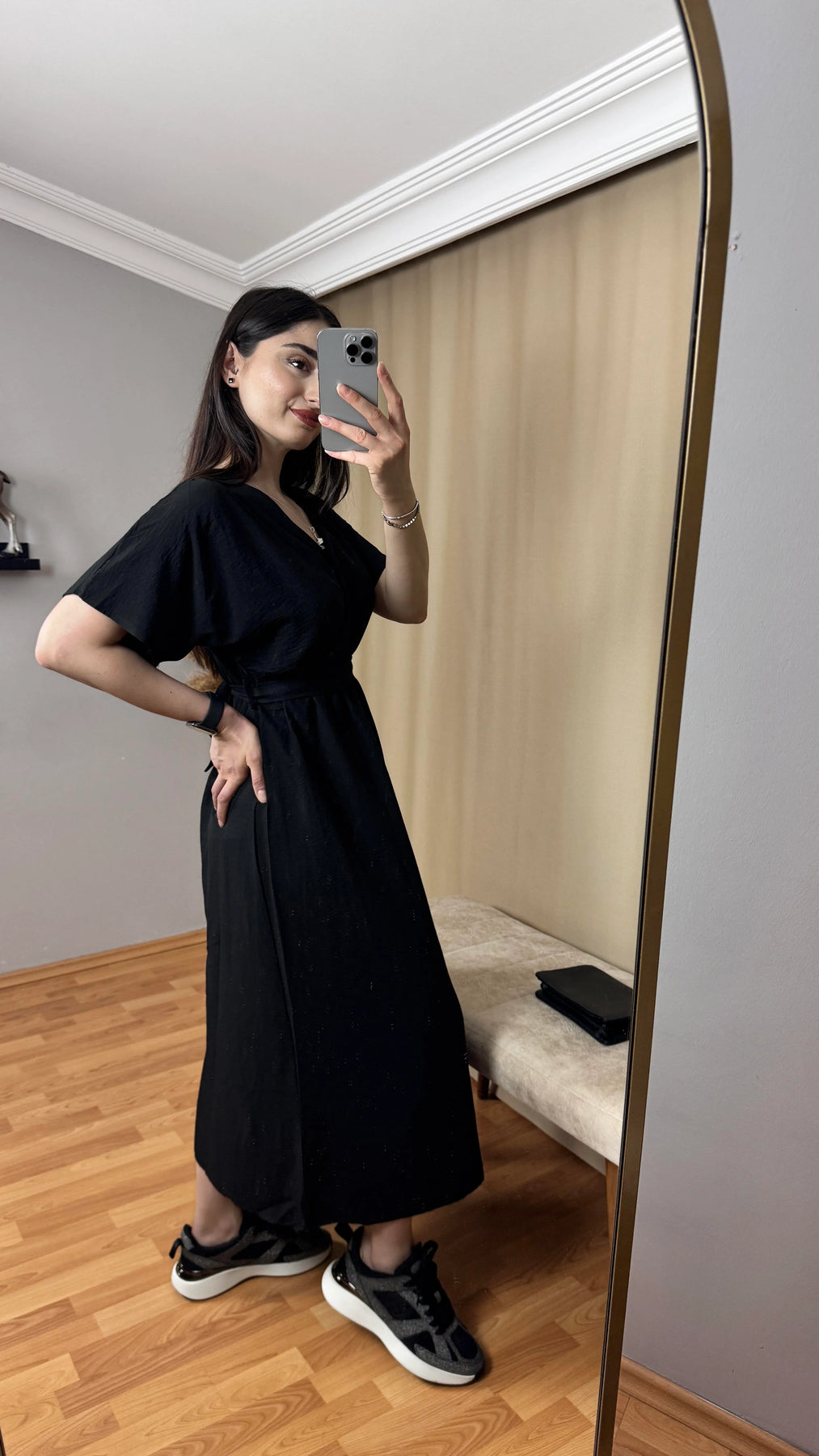 Kuşaklı Midi Boy Pamuk Keten Elbise